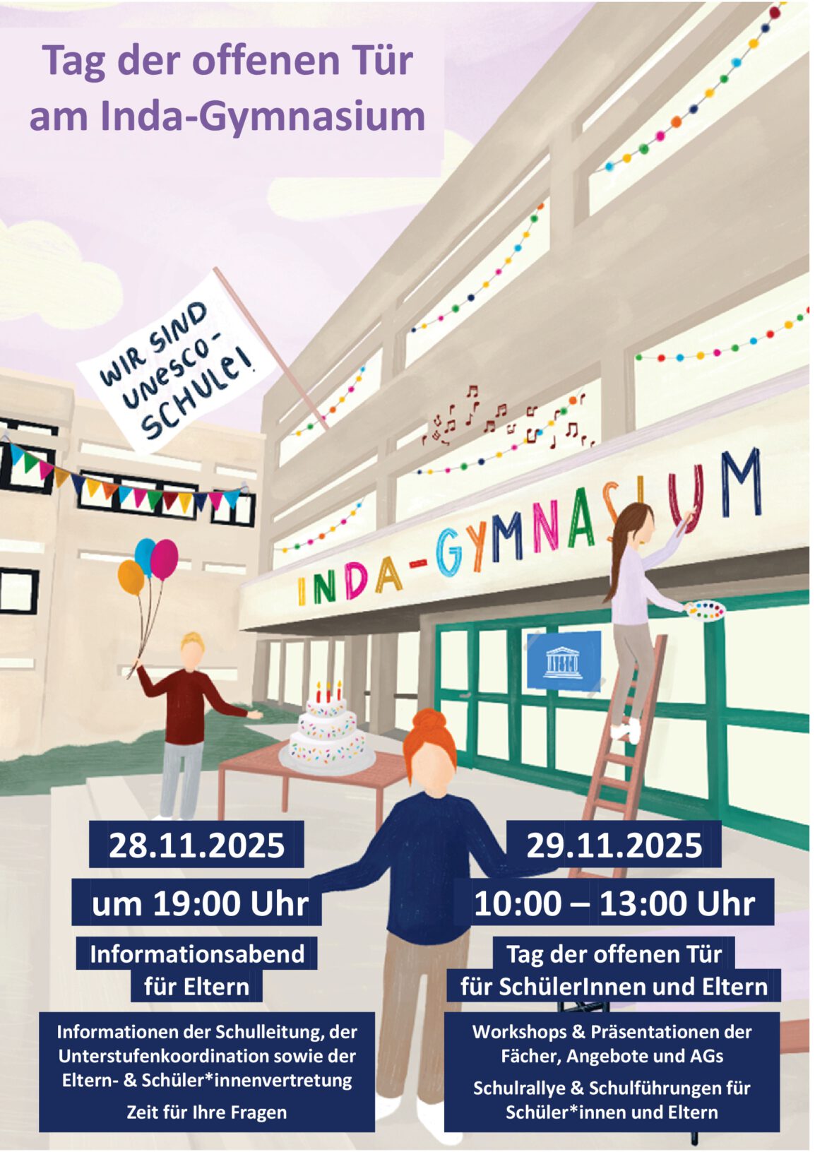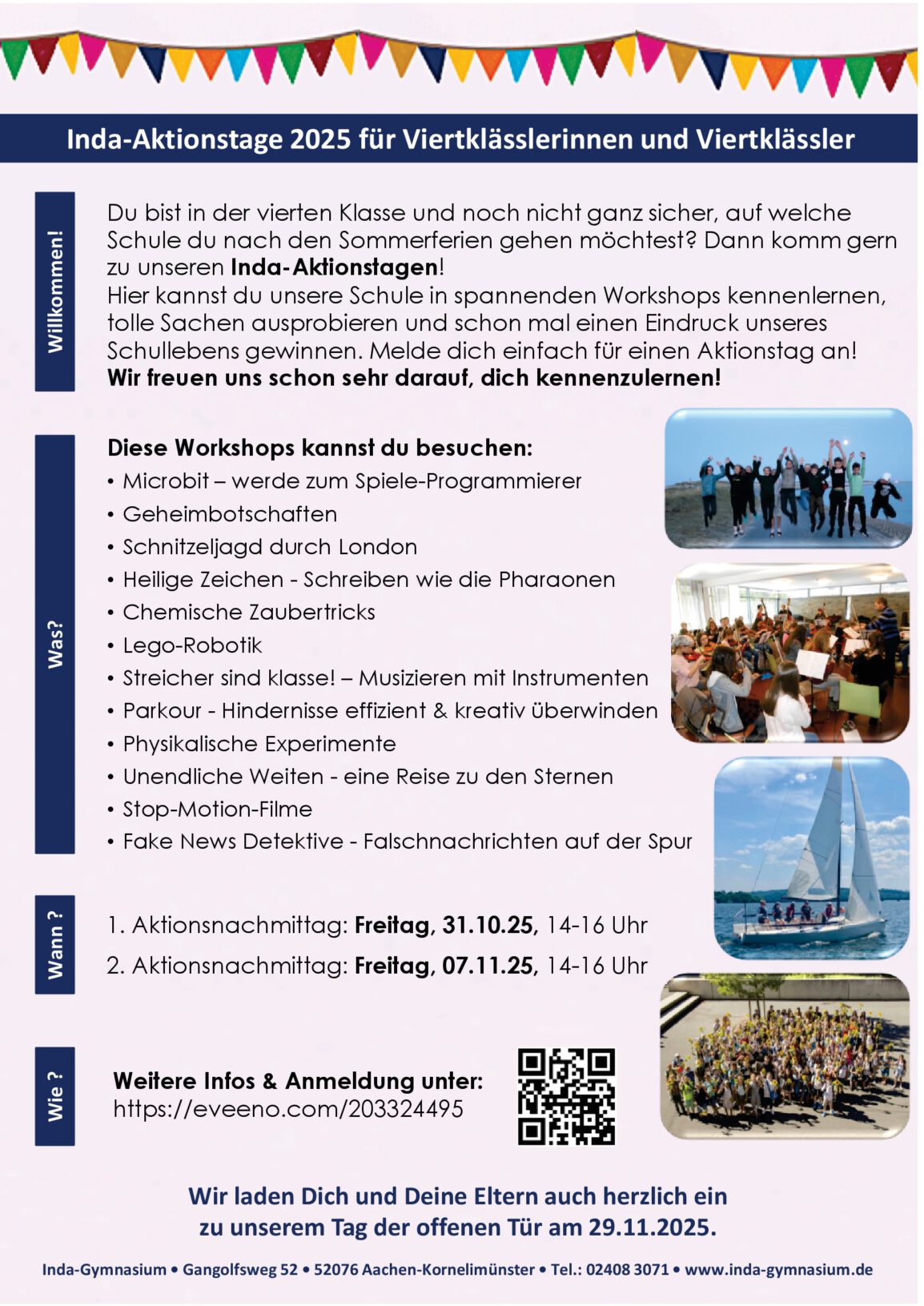 Aktionsnachmittage für Viertklässler:innen: 31.10.2025 + 07.11.2025 14 – 16 Uhr Informationsveranstaltung für Eltern: 28.11.2025 19 Uhr Tag der offenen Tür: 29.11.2025 10 – 13 Uhr Wir freuen uns über ihr Interesse!