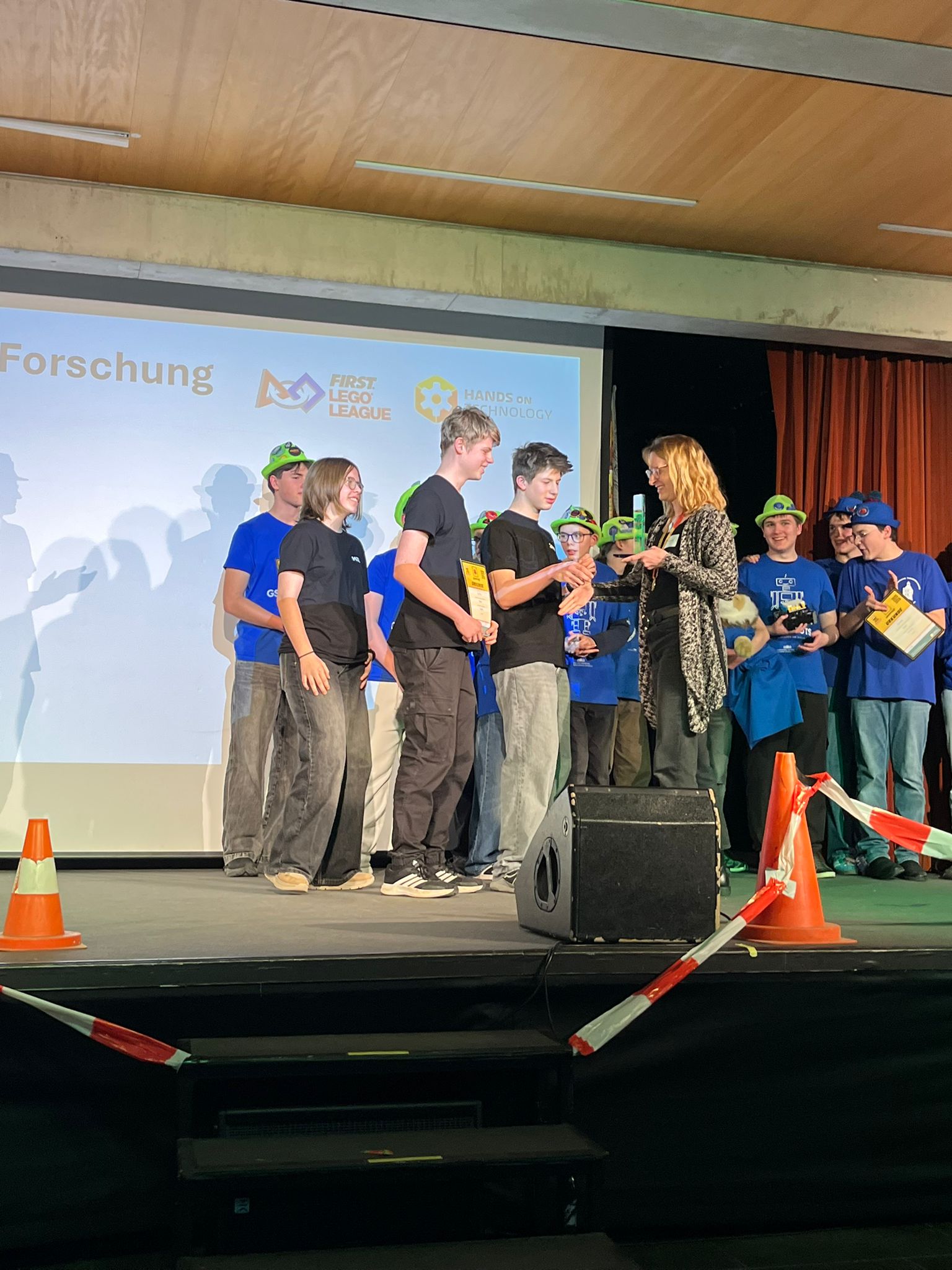 Beim Regionalwettbewerb am Samstag stellte das Inda-Gymnasium 8 der 17 teilnehmenden Teams. Die Sponge Bots konnten sensationell ihren Champion-Titel vom letzten Jahr verteidigen und durften ihr Forschungsprojekt auf der Bühne dem gesamten Publikum präsentieren. Die Inda Blox gewannen den Forschungspokal, indem Sie ein digitales Tool zum Kartieren von Ausgrabungsstätten und zum Markieren von Fundstellen auf der digitalen Karte entwickelten. Dazu braucht man lediglich ein Handy mit Kamera und LiDAR-Sensor, einen Stift aus dem 3D-Drucker und die App der Inda Blox. Diese Technik kann Archäologen auf aller Welt helfen, das Dokumentieren ihrer Funde ins 21.Jahrhundert zu befördern – bisher wird dies noch mit Bleistift auf Millimeterpapier gemacht.