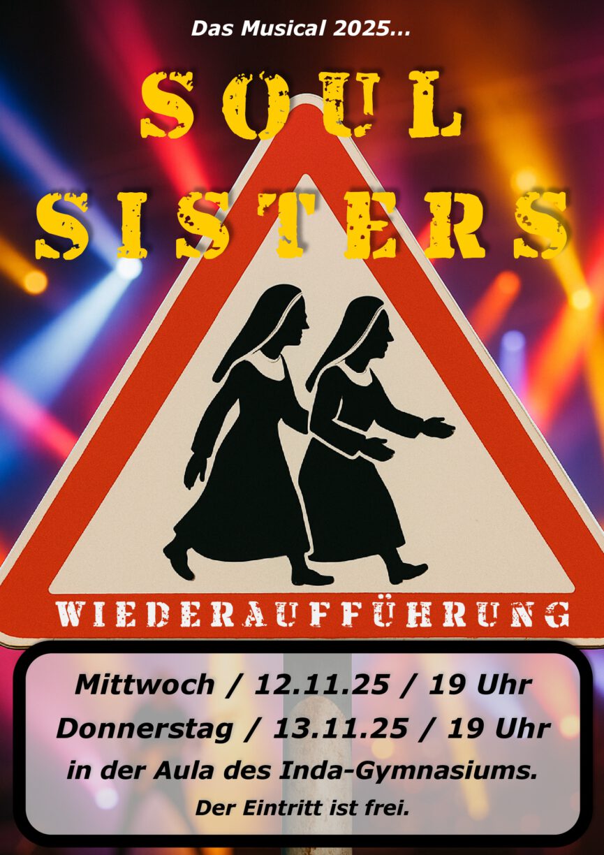 Nach dem großen Erfolg der bisherigen Vorstellungen kommt das Musical The Soul Sisters nun zu seiner finalen Wiederaufführung! Schülerinnen und Schüler des Inda-Gymnasiums präsentieren das humorvolle und mitreißende Stück ein letztes Mal am Mittwoch, den 12. November, und Donnerstag, den 13. November, jeweils um 19 Uhr in der Aula des Inda-Gymnasiums.