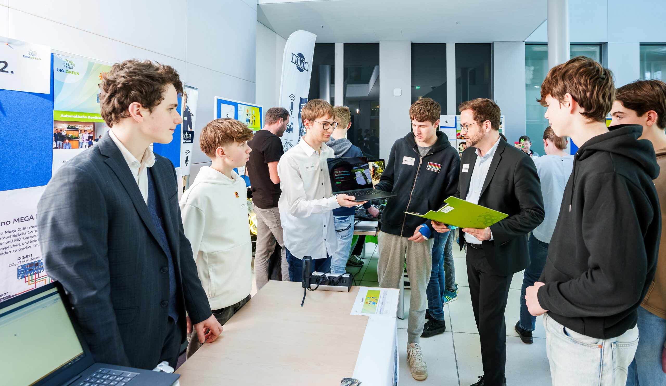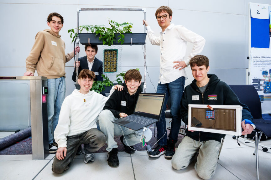 Vor Ort präsentierten die Schüler ihre digital gesteuerte Begrünungswand für Klassenzimmer, die sie in den vergangenen Monaten intensiv weiterentwickelt hatten. Die Kombination aus nachhaltigem Ansatz und technischer Umsetzung überzeugte durch ihre Praxisnähe: Ein System aus Sensorik und automatisierter Versorgung sorgt dafür, dass Pflanzen zuverlässig zur Verbesserung der Raumluft beitragen – ganz ohne zusätzlichen Pflegeaufwand im Schulalltag.