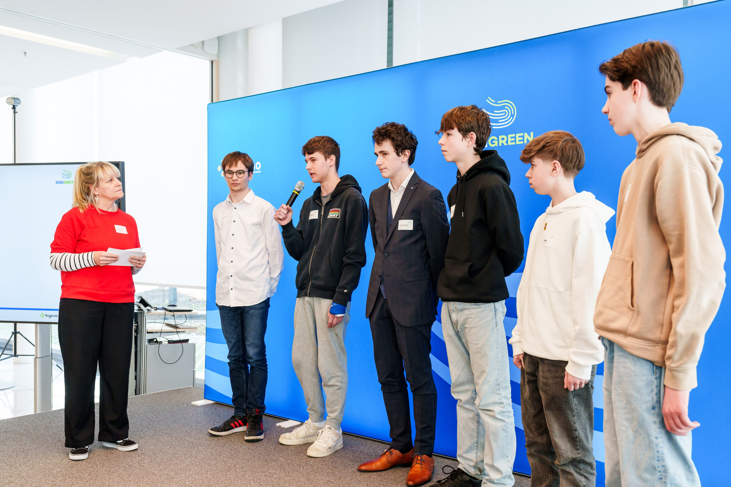 Nach ihrem Erfolg in der ersten Runde des DIGIGREEN-Wettbewerbs durfte die Schülergruppe des Inda-Gymnasiums begleitet durch ihre betreuenden Lehrkräfte Herr Steltzner und Frau Brenneker am 19. März 2026 ihr Projekt in der Zentrale der NRW.BANK in Düsseldorf einer Fachjury vorstellen. Für Jan, David, Maximilian, Alexander, Christian und Leon war dies ein besonderer Meilenstein – und zugleich eine wertvolle Erfahrung.