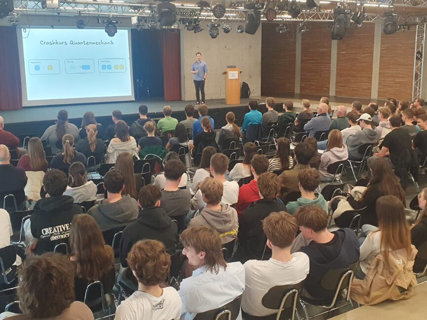 Er präsentierte uns einen spannenden Vortrag zu dem Thema „Quantenphysik – Entdeckung und aktuelle Entwicklungen“. Den Vortrag besuchten die Physikschüler*innen der Oberstufe, welche teilweise schon im Unterricht die Quantenphysik angerissen haben.